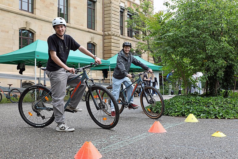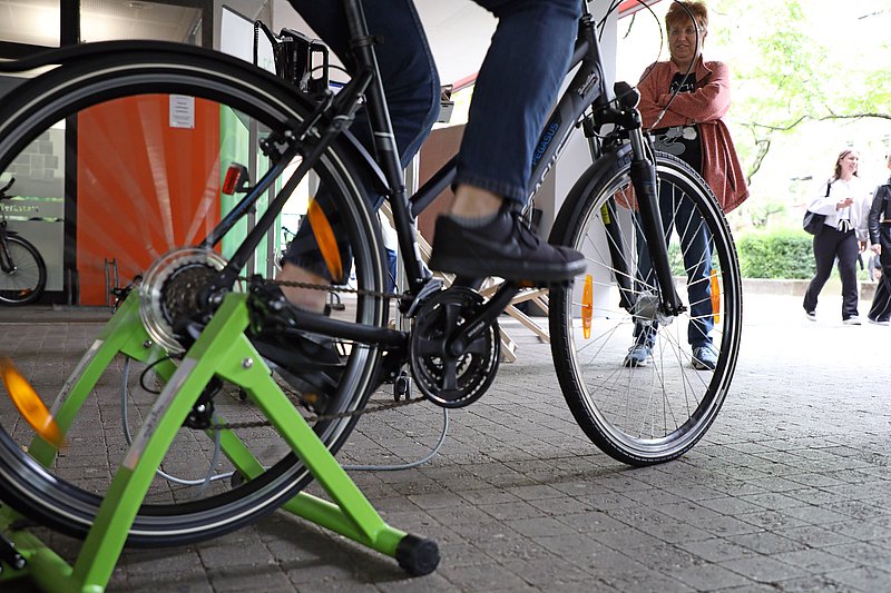 Mitarbeitende sowie Besucherinnen und Besucher hatten am Mittwoch, 4. Juni, Gelegenheit, verschiedene Fahrräder auf einem Parcours zu testen, Fahrradabstellanlagen zu planen, Verbesserungsvorschläge einzubringen, Deskbikes der Hochschulbibliothek auszuprobieren, sich über Radfahren und Gesundheit zu informieren, Strom mit dem Fahrrad zu erzeugen, Fahrradreparaturen mit fachlicher Anleitung durchzuführen oder ihr Wissen rund ums Fahrrad zu testen. Außerdem hatten Schülerinnen und Schüler des Helmholtz-Gymnasiums einen Fahrradparcours gestaltet, der die beiden Aktionsstandorte am Gebäude B der HKA und an den Gebäuden 2 und 3 der PHKA miteinander verband.